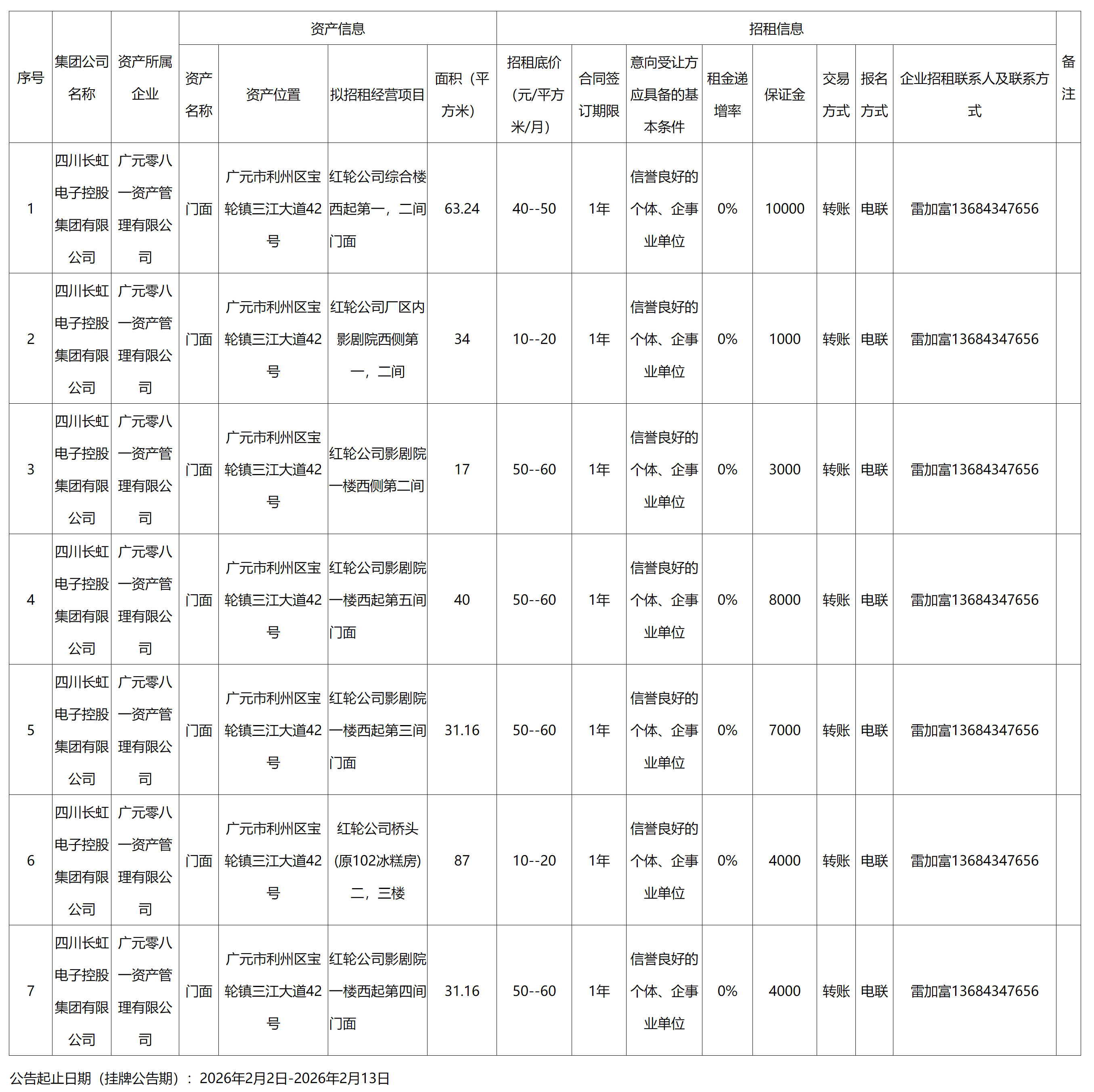 广元零八一资产管理有限公司资产出租公告
