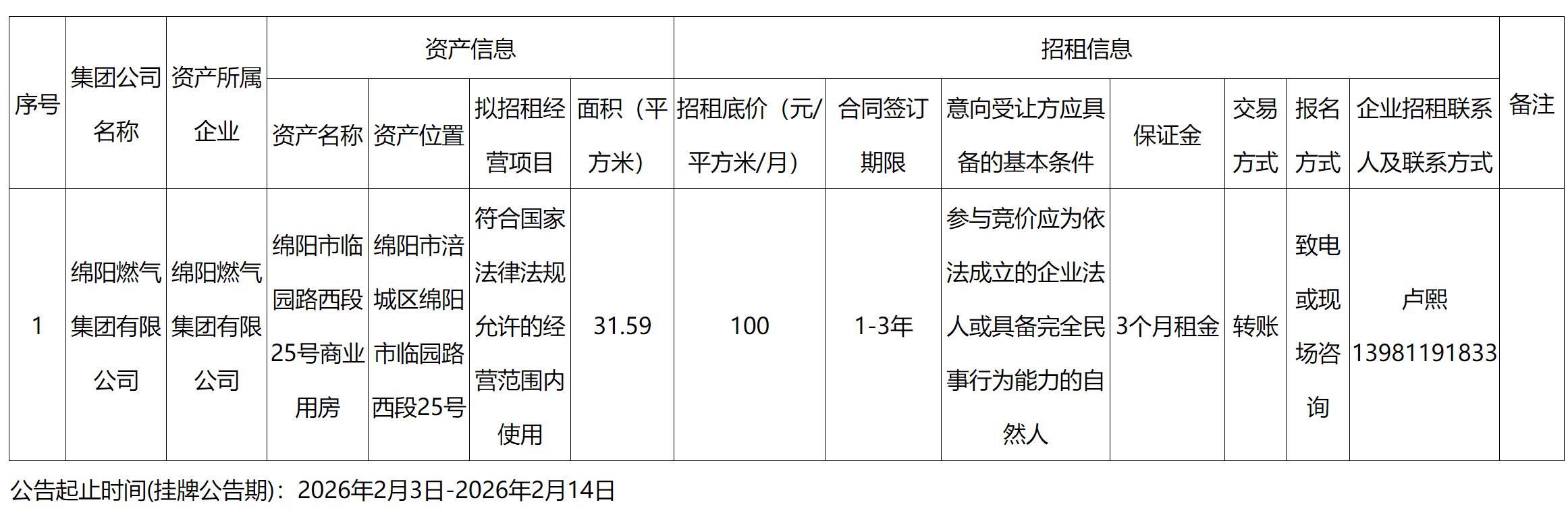 绵阳燃气集团有限公司资产出租公告