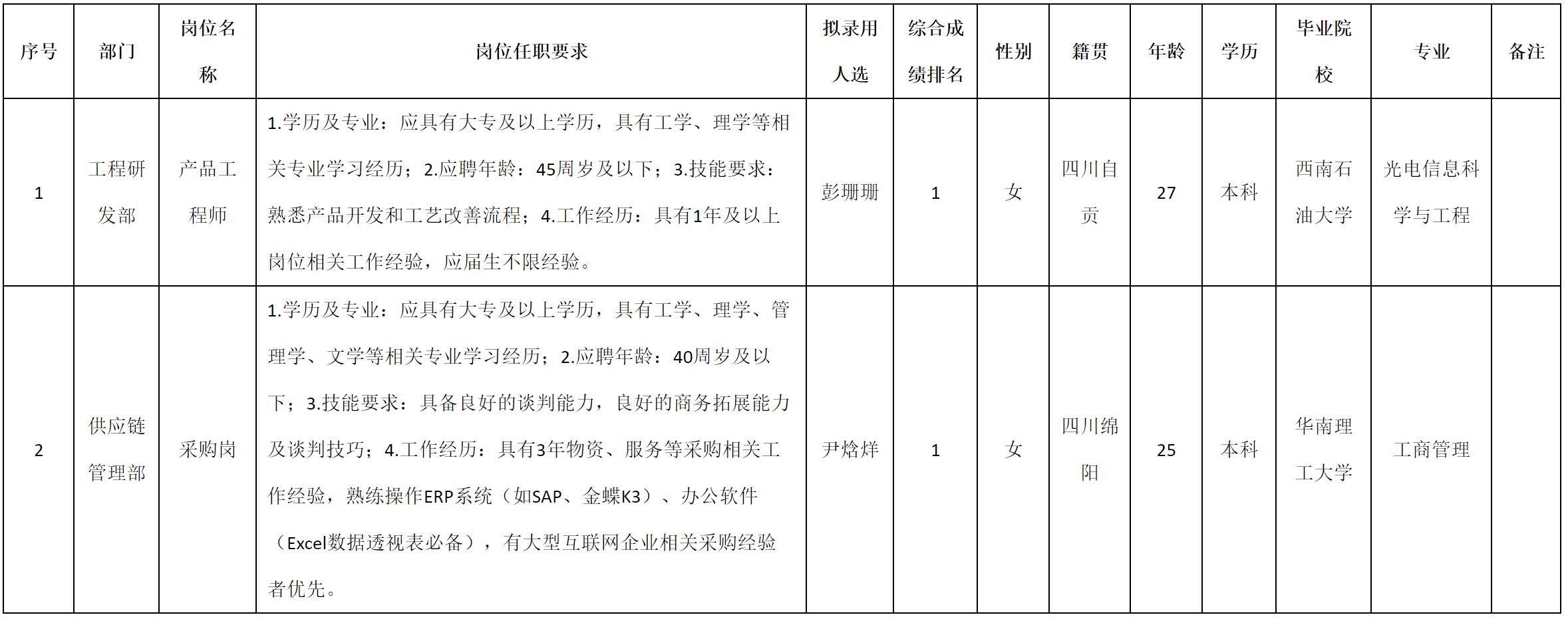 根据四川九华光子通信技术有限公司发布的招聘公告及招聘相关规定,经测试、考察、体检等程序,拟录用彭珊珊等2名同志到四川九华光子通信技术有限公司工作,现予以公示,具体情况如下: