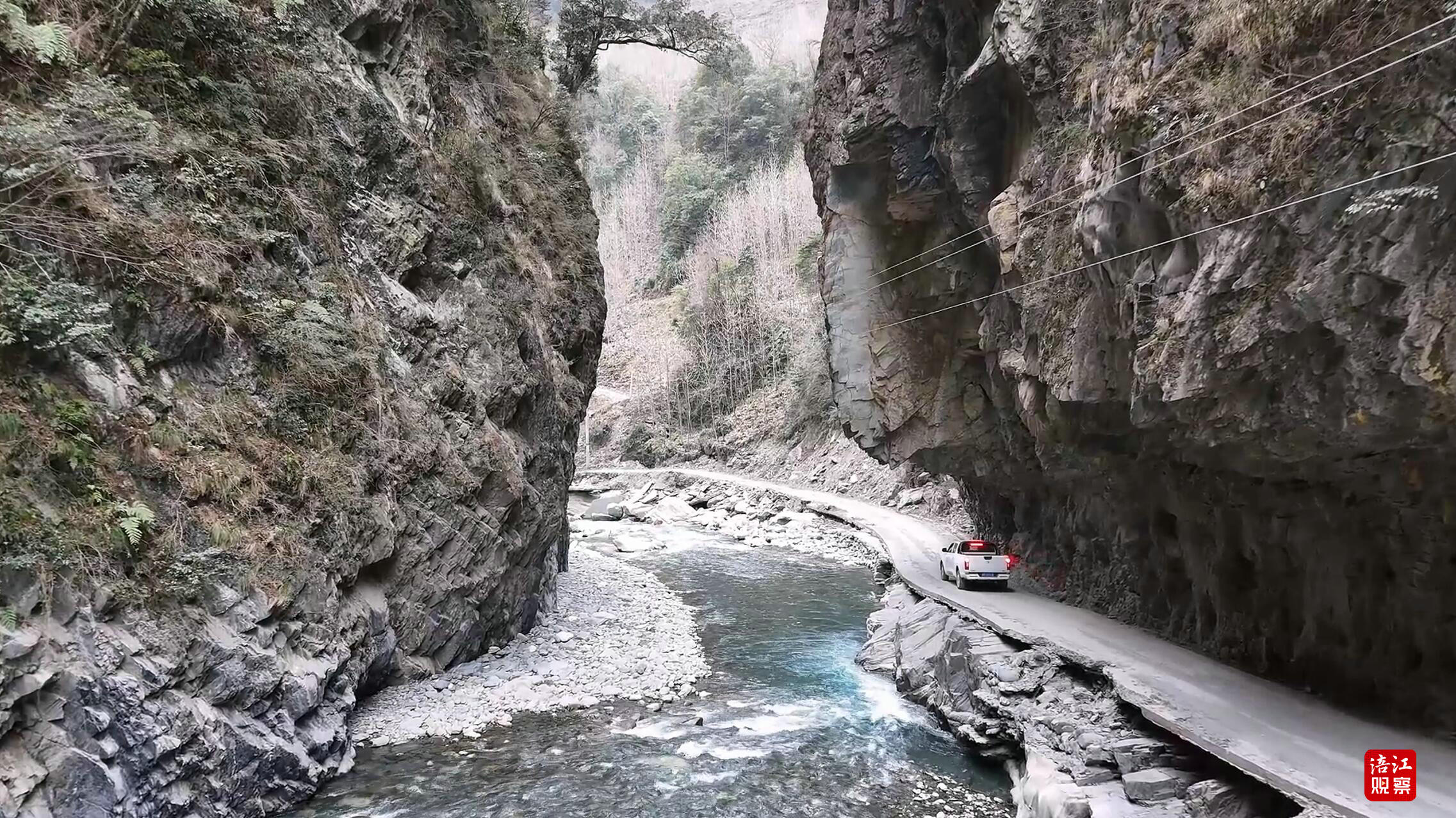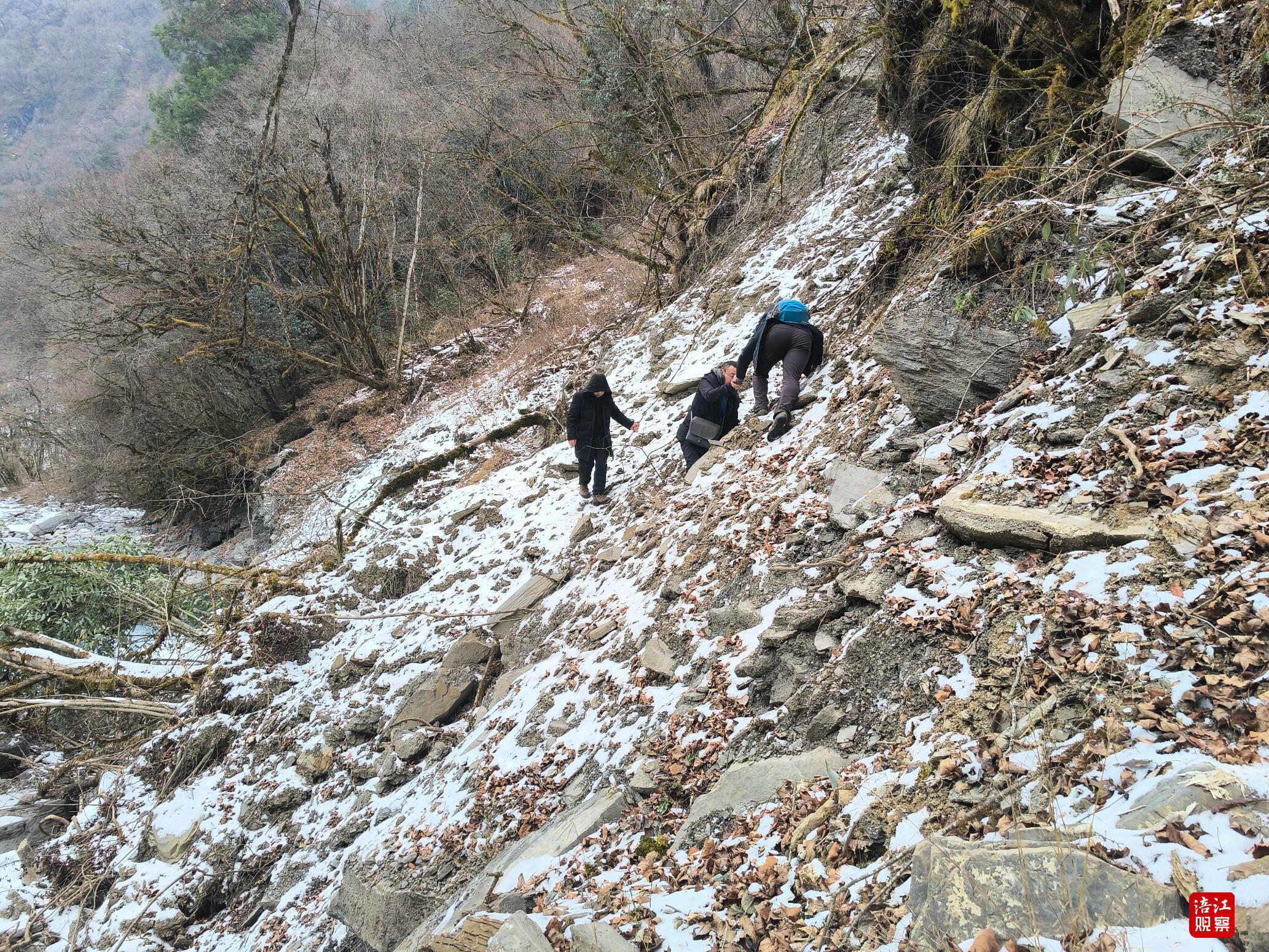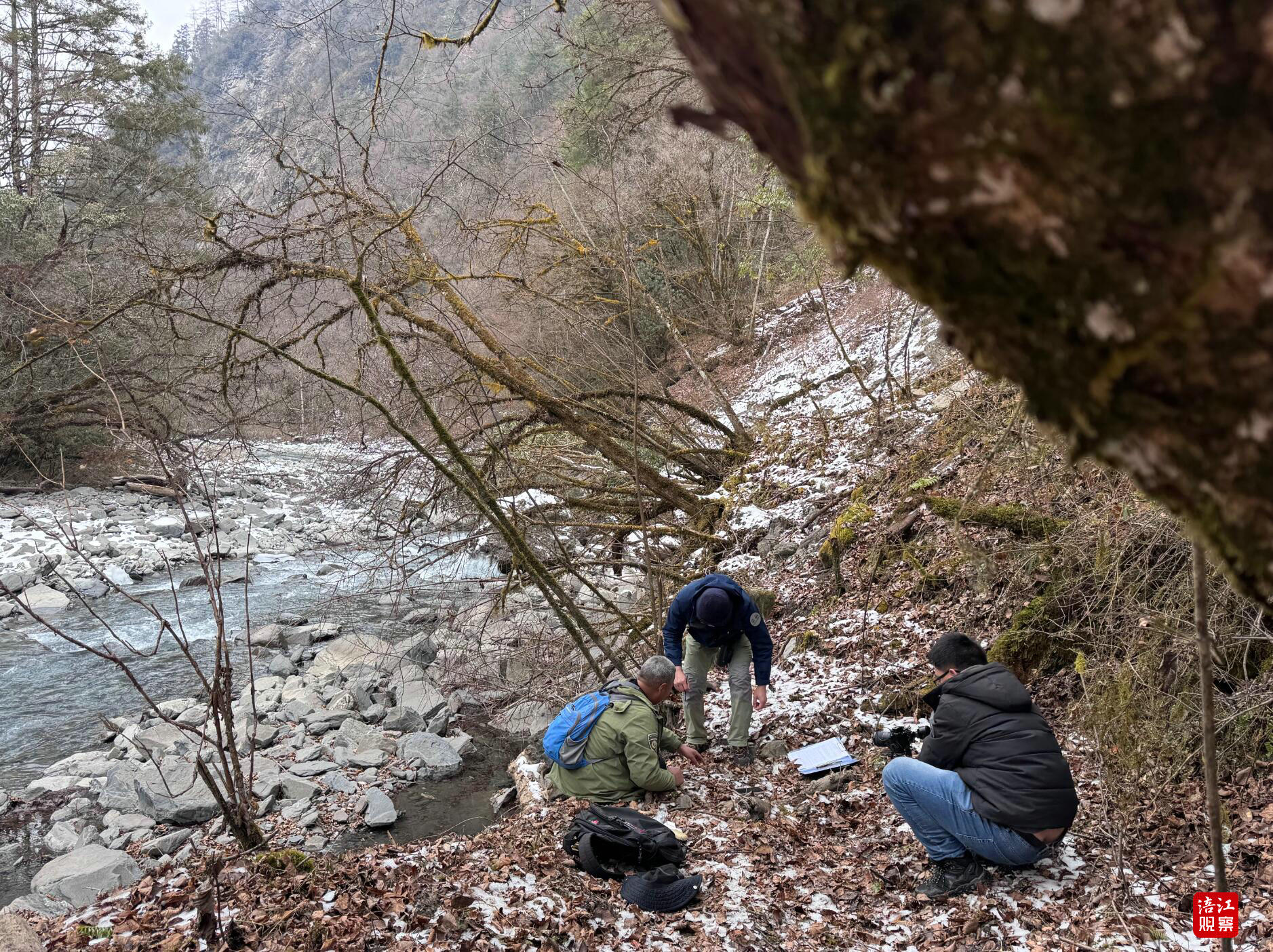 循着水声走向泗耳沟深处,巡护队伍攀爬上近乎垂直的陡坡,踏过覆冰的河滩,被一道三十米宽的急流拦住去路。