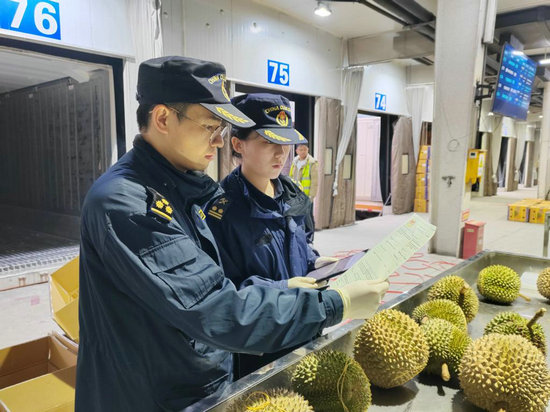 1月15日,友谊关海关工作人员对进口榴莲实施检疫查验。新华社发(南宁海关供图)
