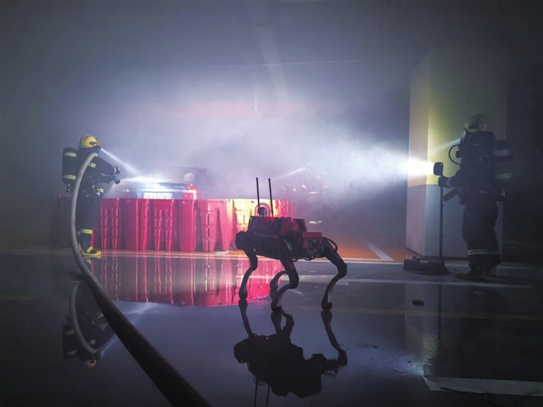 演练模拟高层建筑地下车库电动车充电燃烧,现场浓烟密布,存在爆炸风险且建筑结构不稳定。应急搜救四足机器人依托高清成像设备与智能识别算法,突破视觉限制深入现场,在昏暗密闭环境中完成火情侦查、火点定位、有毒气体检测及现场动态监测等任务,实时回传数据至指挥中心,为救援决策提供关键支撑,大幅提升搜救效率与安全性。