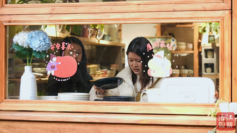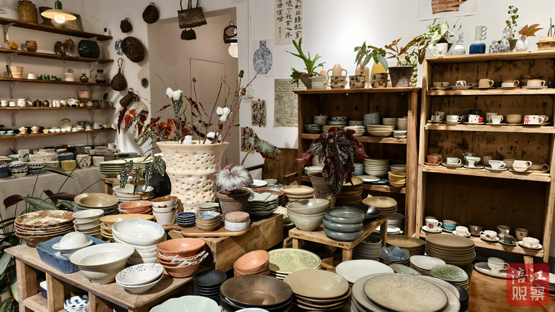 不远处的“有瓷”陶瓷店里,原木货架上整齐陈列着茶杯、手绘花卉碟、马年生肖主题摆件等,各式精致陶艺品错落有致。