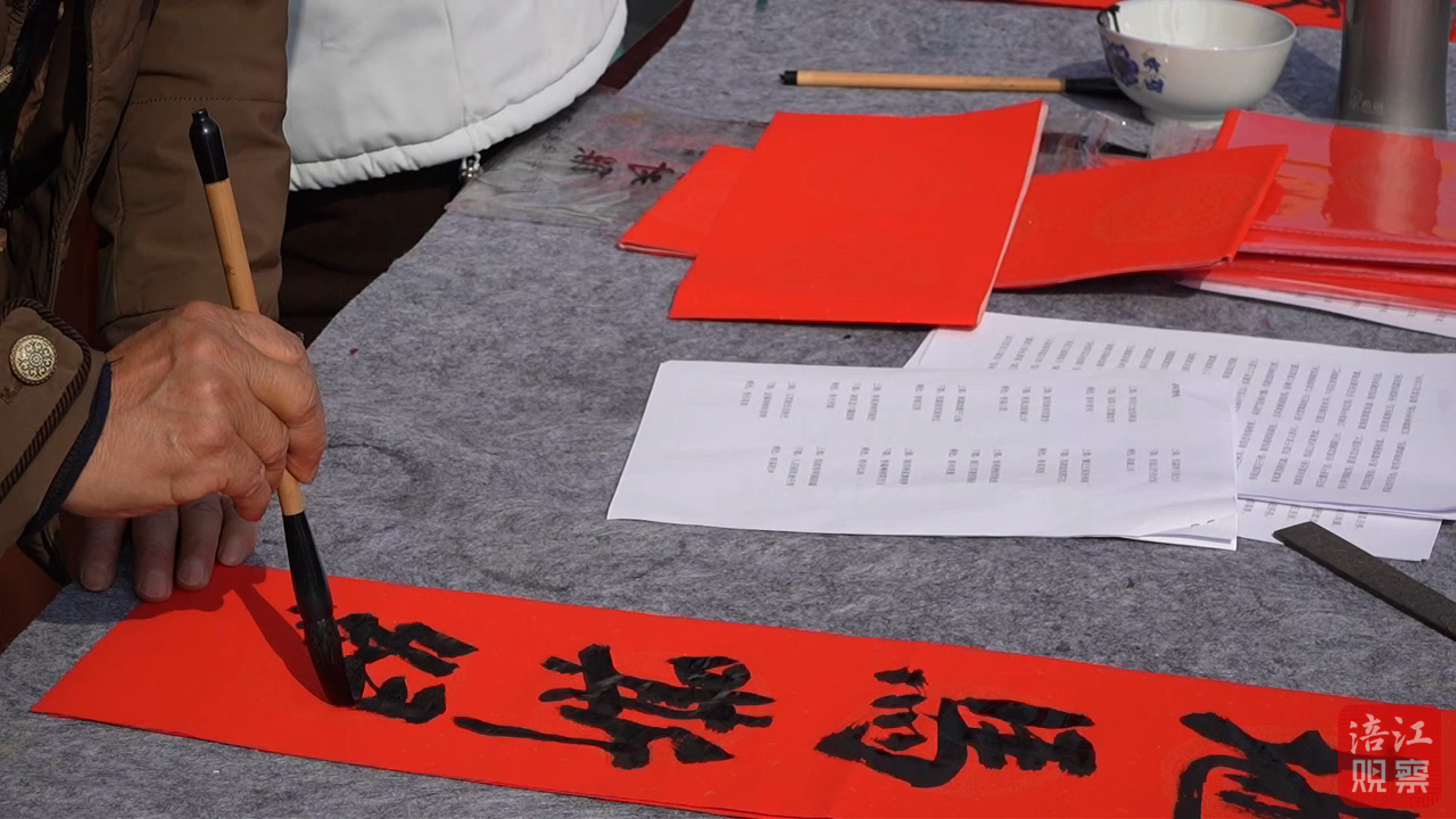 活动现场,红纸铺展,墨香四溢。书法老师挥毫泼墨,楷书工整隽秀、行书潇洒飘逸、隶书古朴典雅,一副副寓意吉祥的春联、一个个饱满喜庆的“福”字在笔下跃然纸上。工作人员将写好的春联和福字逐一赠送给市民。