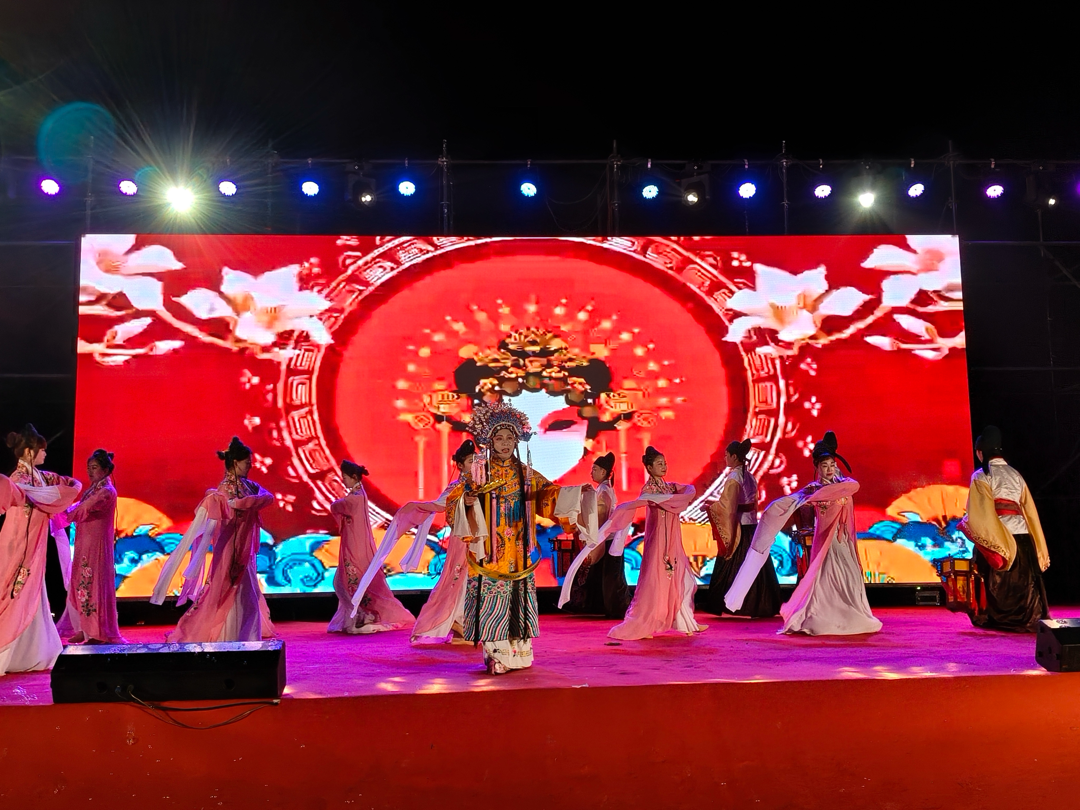 装饰着彩灯与乡土元素的广场中央,开场舞《驭马踏春来》拉开了晚会的序幕。舞台虽然简单,但村民们的热情丝毫不减。歌曲《我们都是盐亭人》《恭喜发财》唱出了红火日子,舞狮、情景舞蹈、京剧、魔术、非遗杂耍等节目轮番登场。