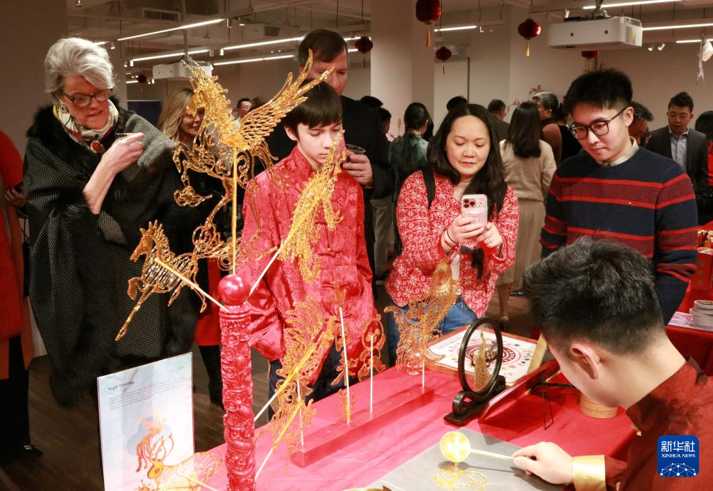 2月9日,在美国纽约曼哈顿南端的华美协进社中华美食烹饪中心,来宾观看糖画制作。新华社发(刘婧雯摄)
