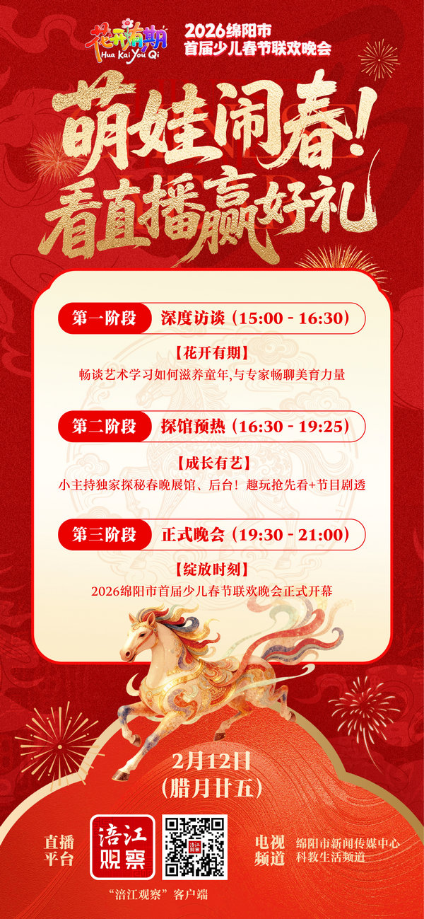 万众期待的2026绵阳市首届少儿春节联欢晚会正式开幕!萌娃们将轮番登台,用歌声、舞蹈、才艺演绎童真美好,呈现一场精彩纷呈的视听盛宴。