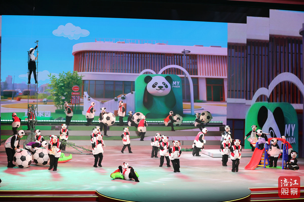 少儿歌舞《你好呀!朋友》中熊猫装扮的孩童在足球道具间嬉戏,童稚笑声穿透屏幕直抵人心;