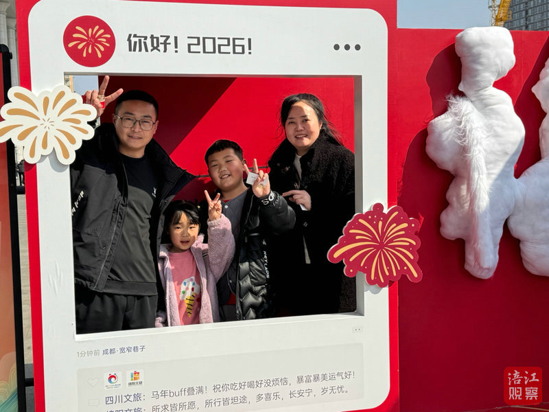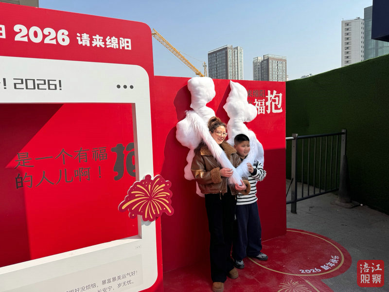 不远处的“青睐绵阳”宣传展板前,从外地返乡的敬女士一家正在合影留念。“这个宣传很及时,春节假期我们正好可以带家人去玩一玩。”敬女士说,她和丈夫常年在外工作,这次回家看到家乡的文旅推广,感到既亲切又自豪。她的两个孩子举着福字,兴奋地对着镜头比出“V”字手势。