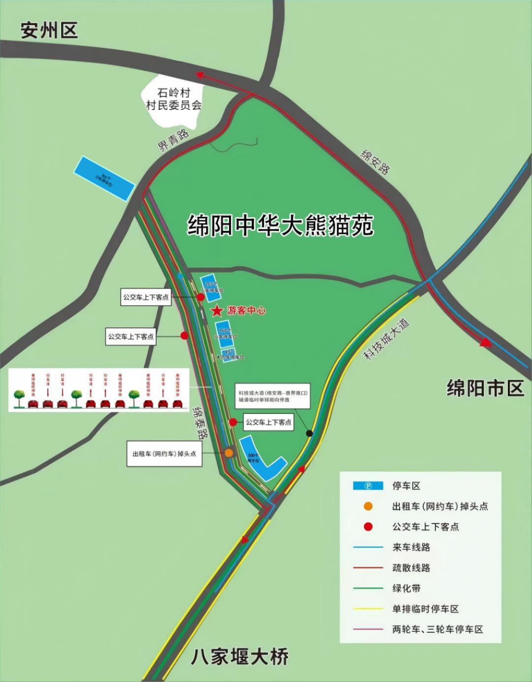 针对自驾需要停车的游客,绵阳中华大熊猫苑新增4号停车场提供500个车位;新增临时停车场提供300个车位;熊猫大道两侧春节期间可停放车辆,可满足1000余辆小型车辆停车需求。加上原有三个停车场,共计可提供3000余个停车位,所有车位均免费停放。