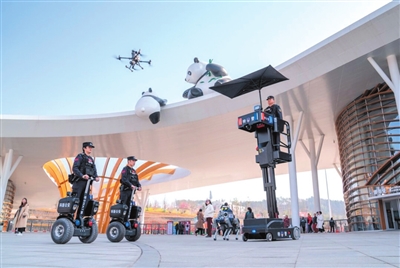 民警在绵阳中华大熊猫苑通过先进警用装备执勤,维护景区秩序。 记者 刘晏男 摄