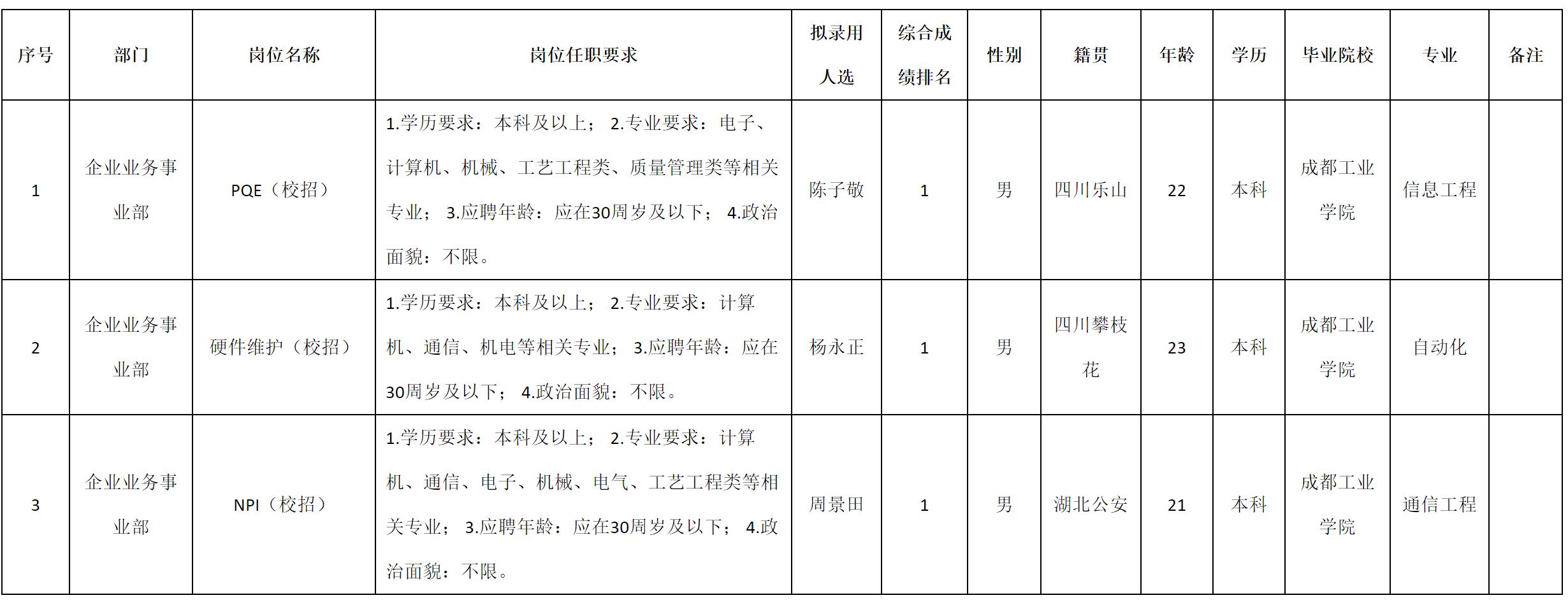 根据四川九州电子科技股份有限公司发布的招聘公告及招聘相关规定,经测试、考察、体检等程序,拟录用陈子敬等3名同志到四川九州电子科技股份有限公司工作,现予以公示,具体情况如下:
