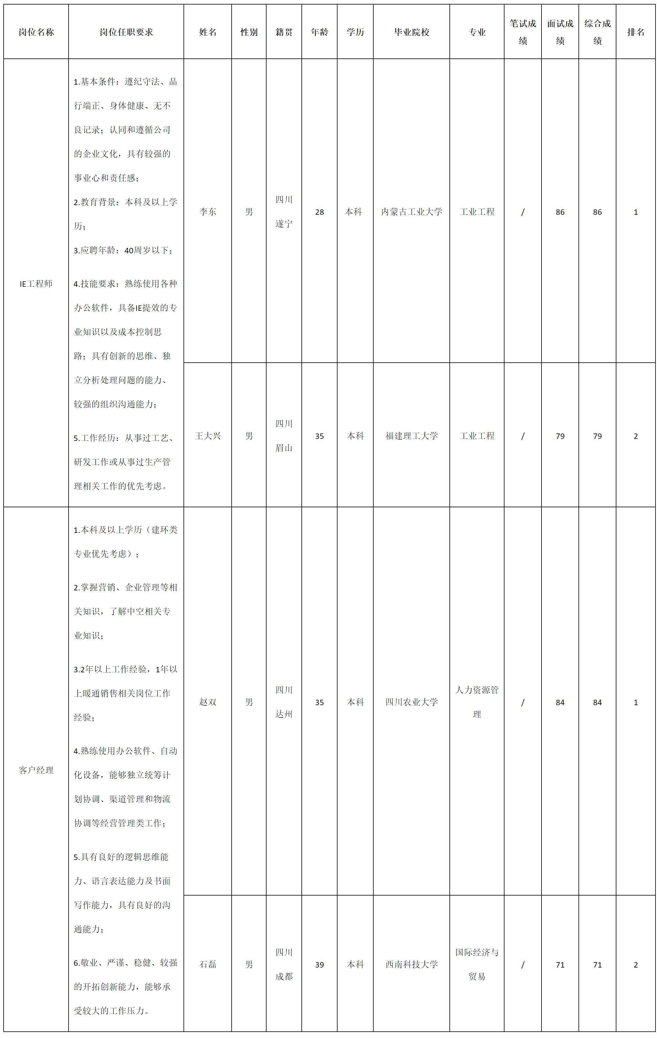 根据四川长虹空调有限公司发布的招聘公告及招聘相关规定,经面试等程序,现将面试成绩予以公示。