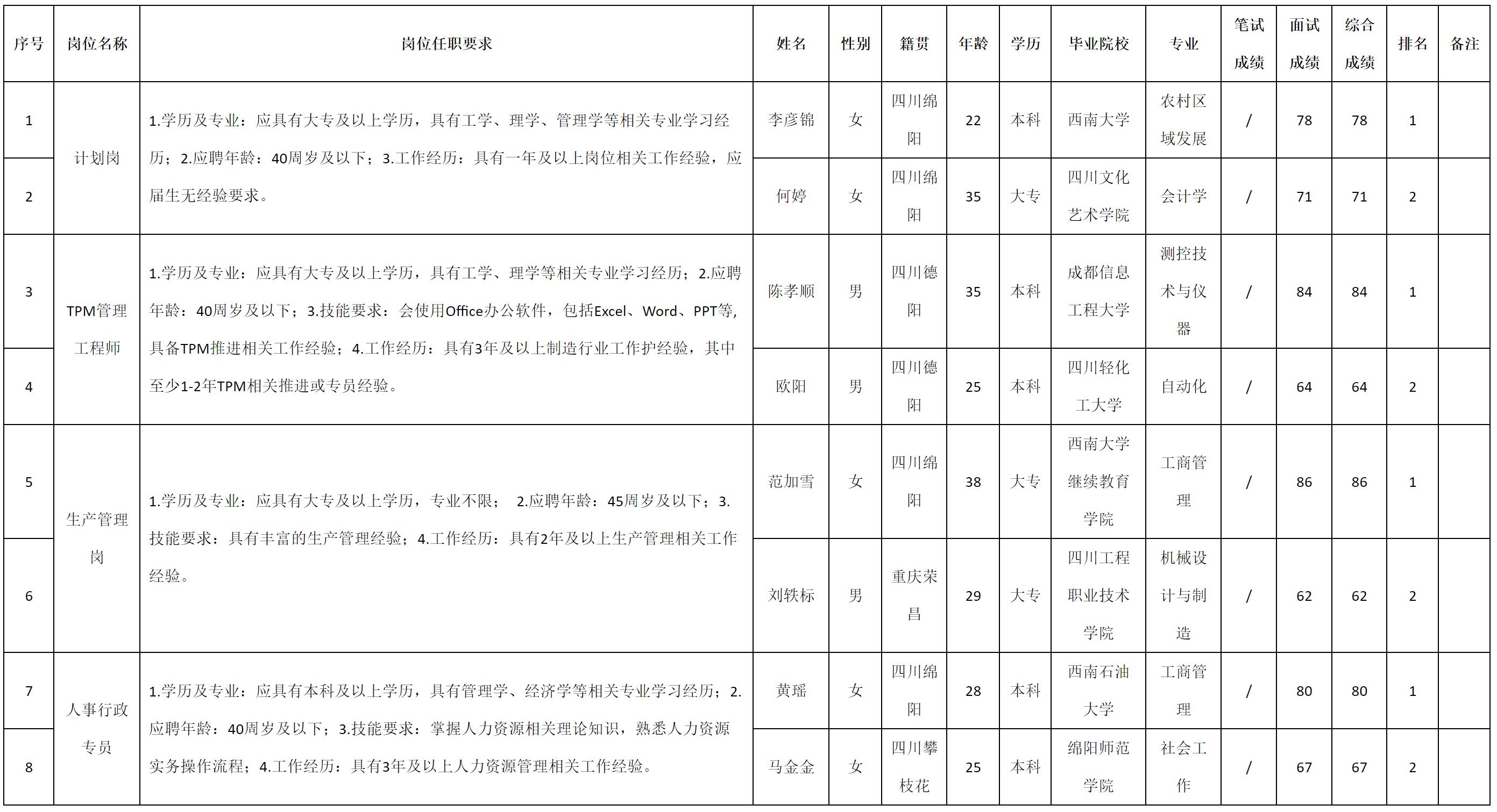 四川九华光子通信技术有限公司关于招聘计划岗等岗位测试成绩的公示