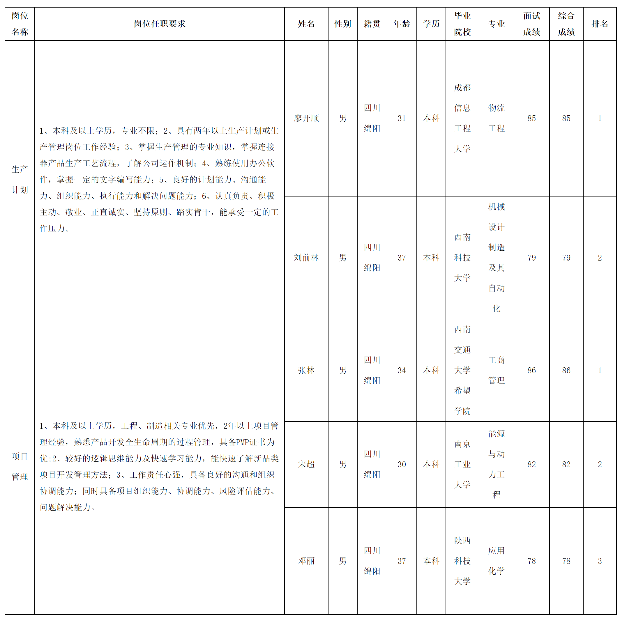 根据四川华丰科技股份有限公司发布的招聘公告及招聘相关规定,经面试等程序,现将测试成绩予以公示。