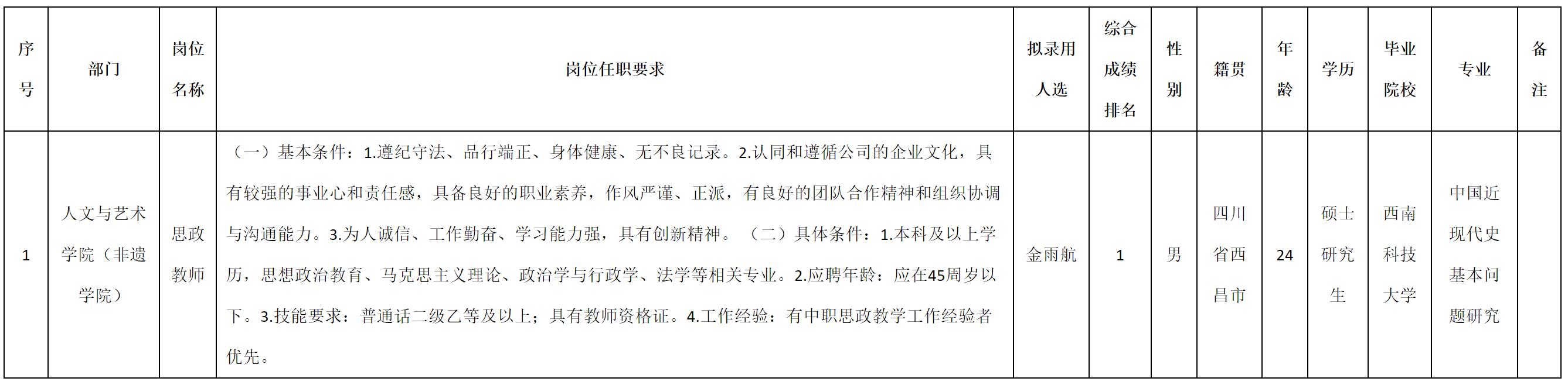 根据四川九洲教育投资管理有限公司发布的招聘公告及招聘相关规定,经测试、考察、体检等程序,拟录用金雨航同志到四川九洲教育投资管理有限公司工作,现予以公示,具体情况如下:
