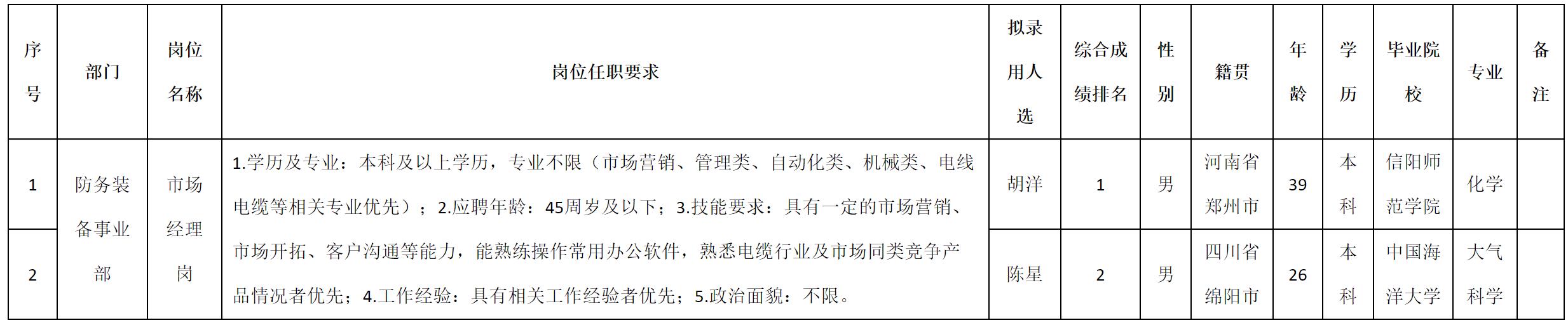 根据四川九洲线缆有限责任公司发布的招聘公告及招聘相关规定,经测试、考察、体检等程序,拟录用胡洋等2名同志到四川九洲线缆有限责任公司工作,现予以公示,具体情况如下:
