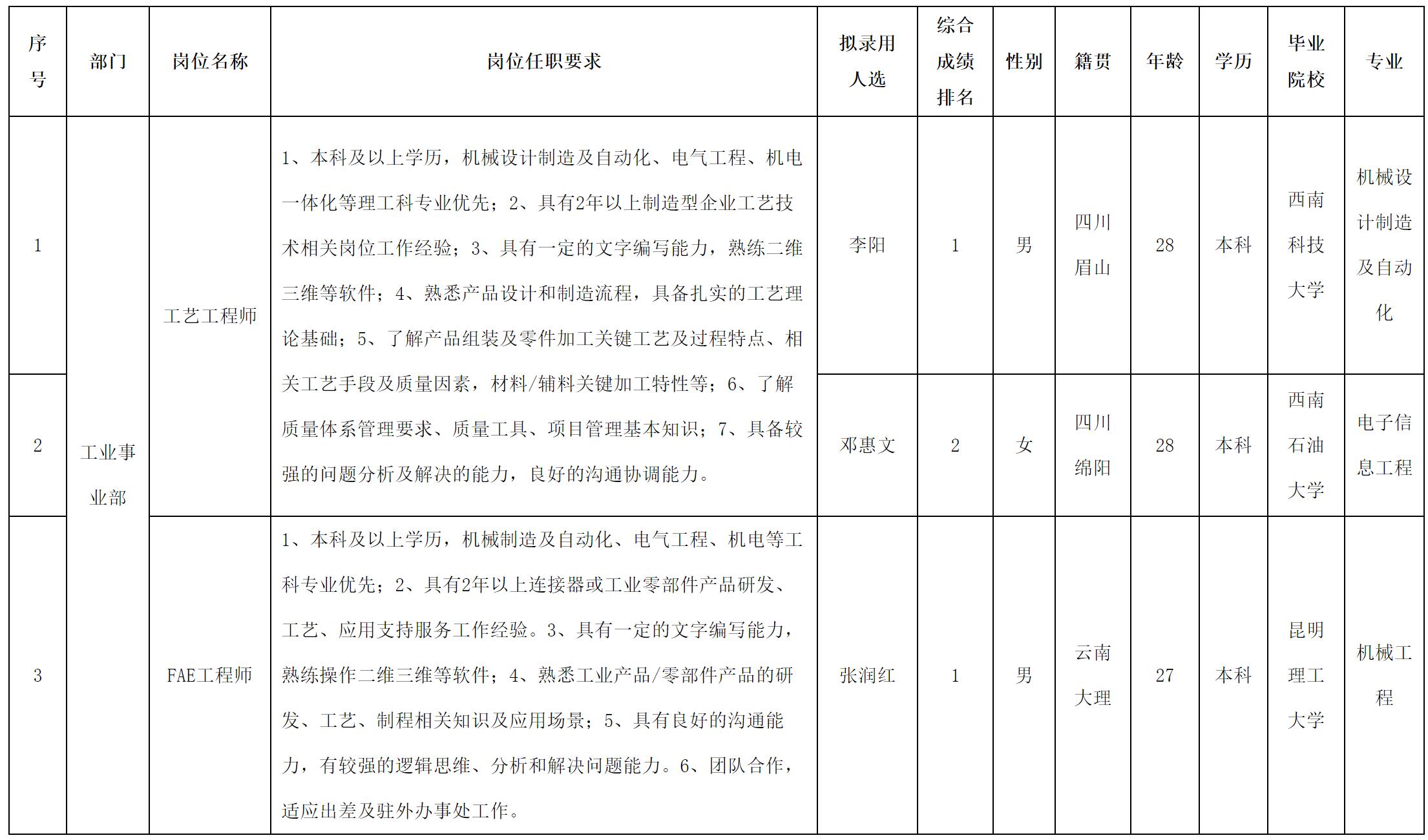 根据四川华丰科技股份有限公司发布的招聘公告及招聘相关规定,经测试等程序,拟录用李阳等同志到四川华丰科技股份有限公司工作,现予以公示,具体情况如下: