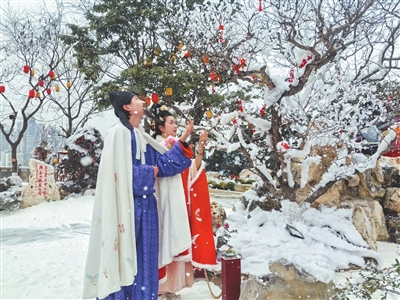 游客身着汉服在龟山上赏“雪”。 记者 唐显枚 摄