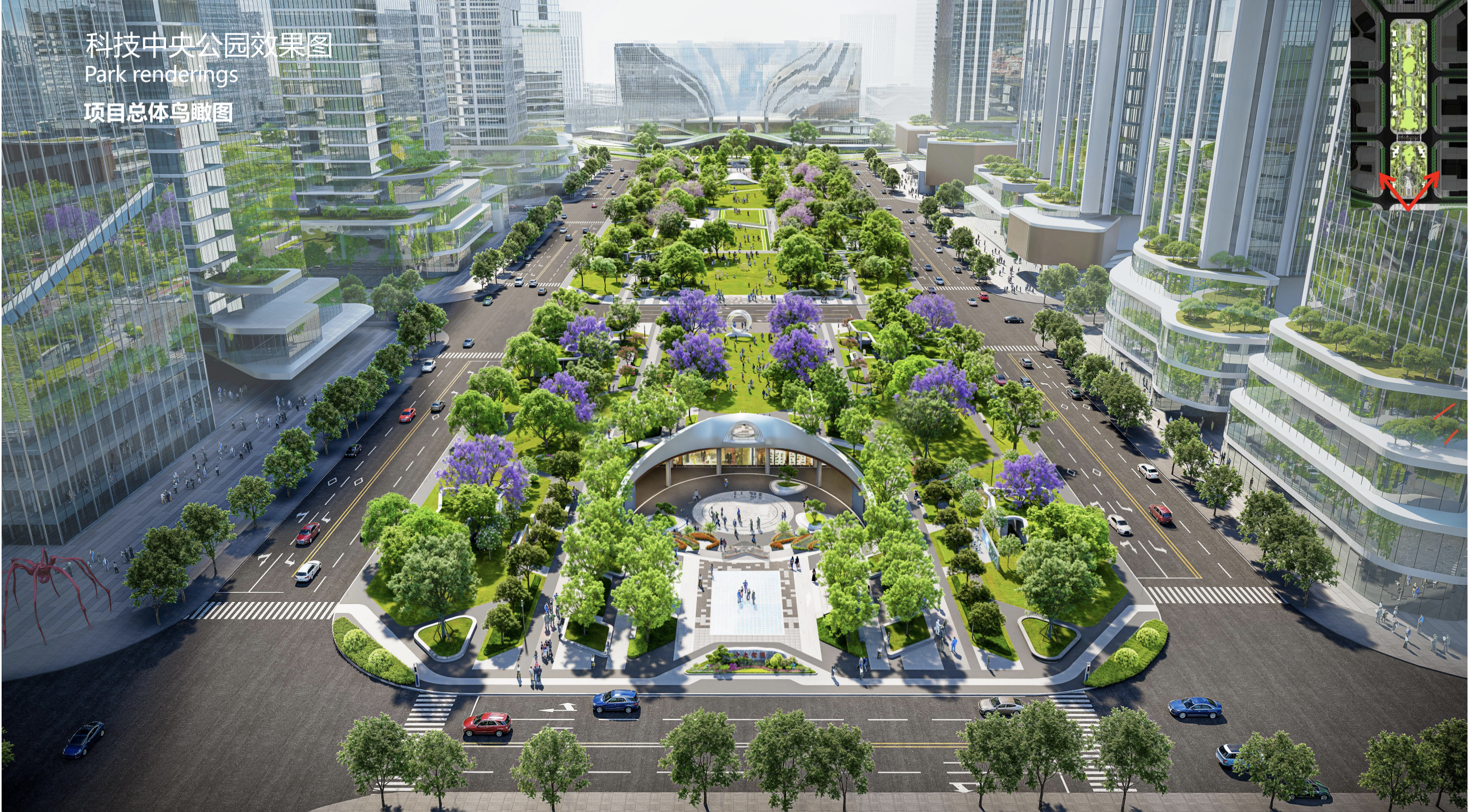 俯瞰之下,地面空间将作为公园功能,打造大面积绿地空间,并融入景观建设。园区颜值高、充满时尚美学,满足市民对公园绿地和优美生态环境需求。