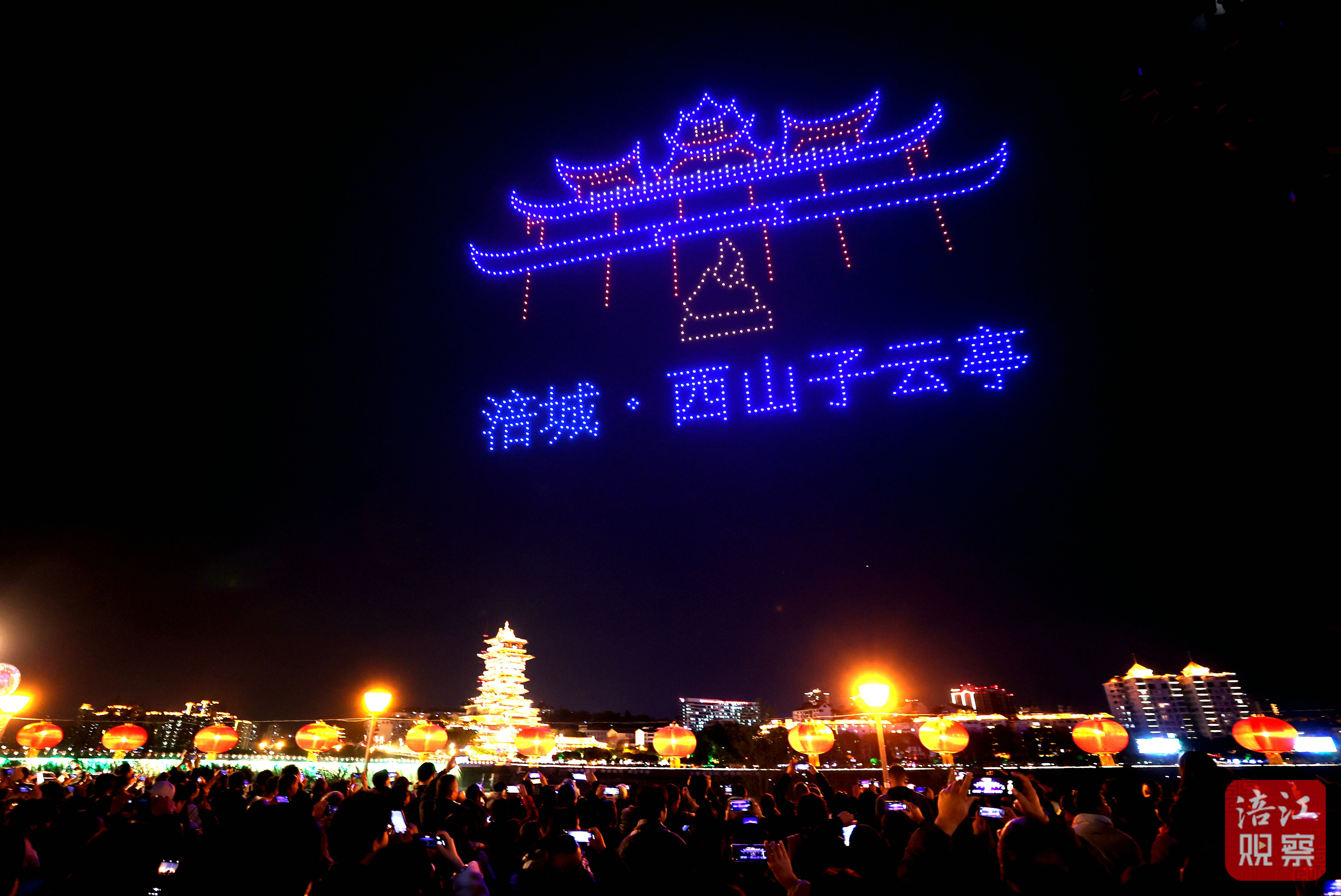 晚上8点不到,滨江广场上已是人头攒动,大家扶老携幼等候展演开幕。8点30分,随着无人机编队如点点闪烁星辰般缓缓升空,现场立刻爆发出阵阵欢呼。
