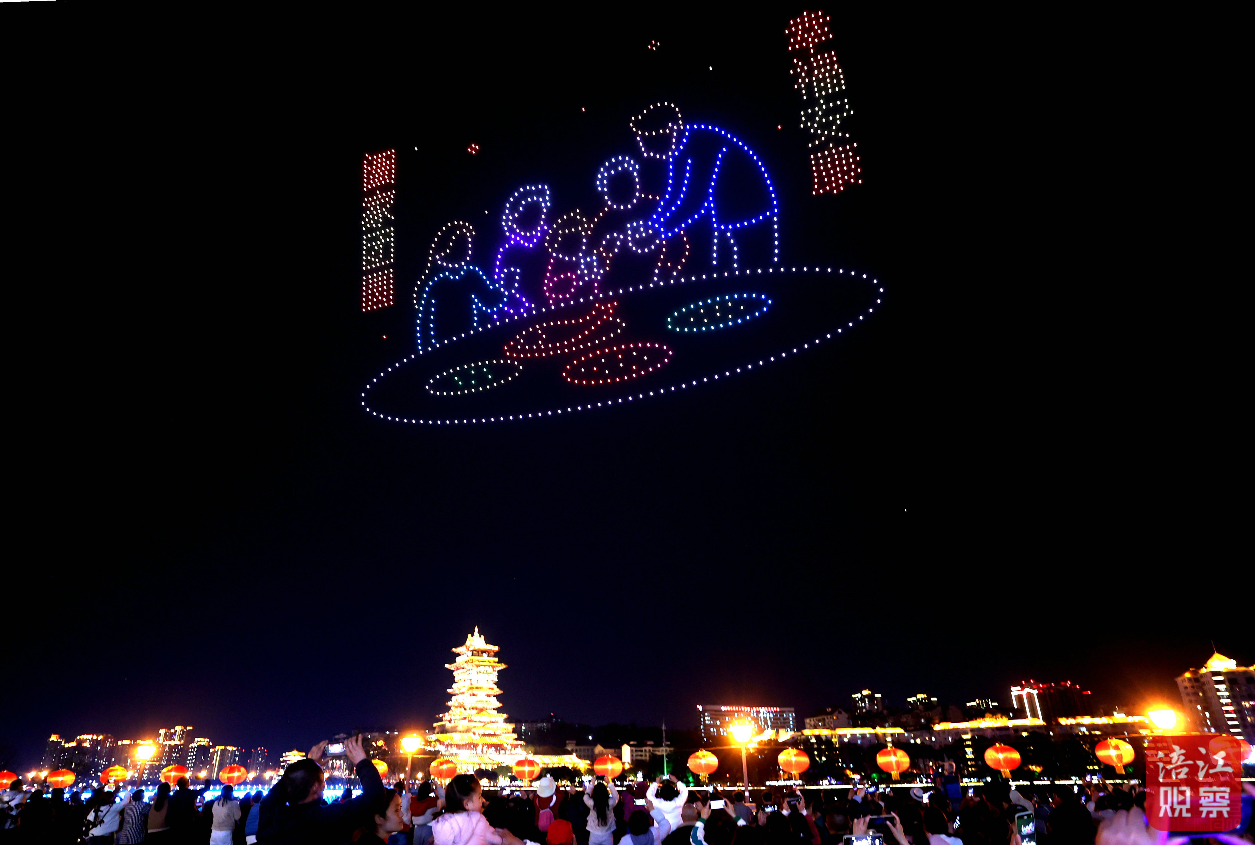 光影流转间,西山子云亭、富乐山、罗浮山温泉、李白故里、三台古城楼等绵阳各区市县的地标建筑依次登场,细腻光影勾勒出建筑之美,诉说着绵阳独具特色的文旅资源,饱含对城市的热爱以及对各地游客的诚挚邀约。临近尾声,无人机再次不停变幻闪烁,最终定格的“恭祝元宵快乐”的字样在夜空中交汇成一条流动的星河,与涪江两岸的万家灯火遥相呼应,为观众送上最浪漫的团圆祝福。