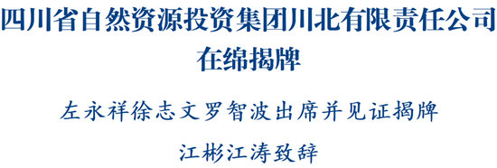 绵阳新闻网讯 3月3日,四川省自然资源投资集团川北有限责任公司在绵揭牌。省委常委、市委书记左永祥,省自然资源厅党组书记、厅长徐志文,四川省自然资源投资集团党委书记、董事长罗智波出席活动并见证揭牌。市委副书记、代市长江彬,四川省自然资源投资集团党委副书记、副董事长、总经理江涛致辞。