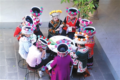 2月9日,金瑞瑞召集绣娘在自己的工作室内了解她们对彝绣产业发展的建议。 新华社记者 陈欣波 摄