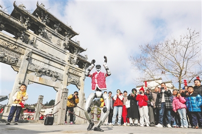 2月18日,游客在安徽省黟县西递古村观看机器人表演。 新华社发 施亚磊 摄