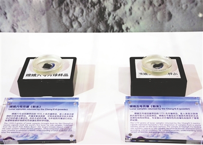 2025年11月5日在第八届进博会国家展中国馆拍摄的“嫦娥五号”月壤和“嫦娥六号”月壤。 新华社记者 刘颖 摄