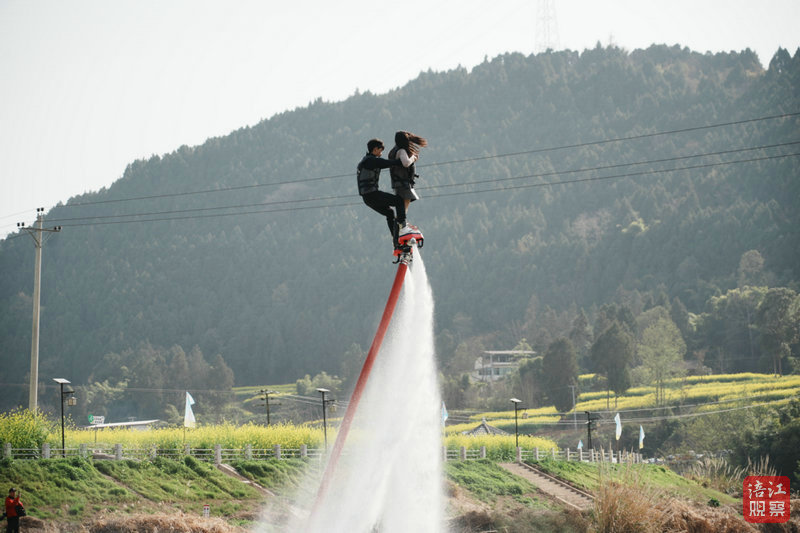 而在地面,另一种独特的视角同样引人入胜。魏城河畔,水上飞人表演者张强脚踩水柱腾空而起,在油菜花田上空做出各种高难度动作。“这是我第三年来这里表演,” 这位前专业跳水运动员说,“每年花期不同,表演时要特别注意避开低垂的花枝。”岸边,带着孩子的刘女士一家仰头看得入神,她五岁的儿子不停地问:“叔叔是怎么飞起来的?”