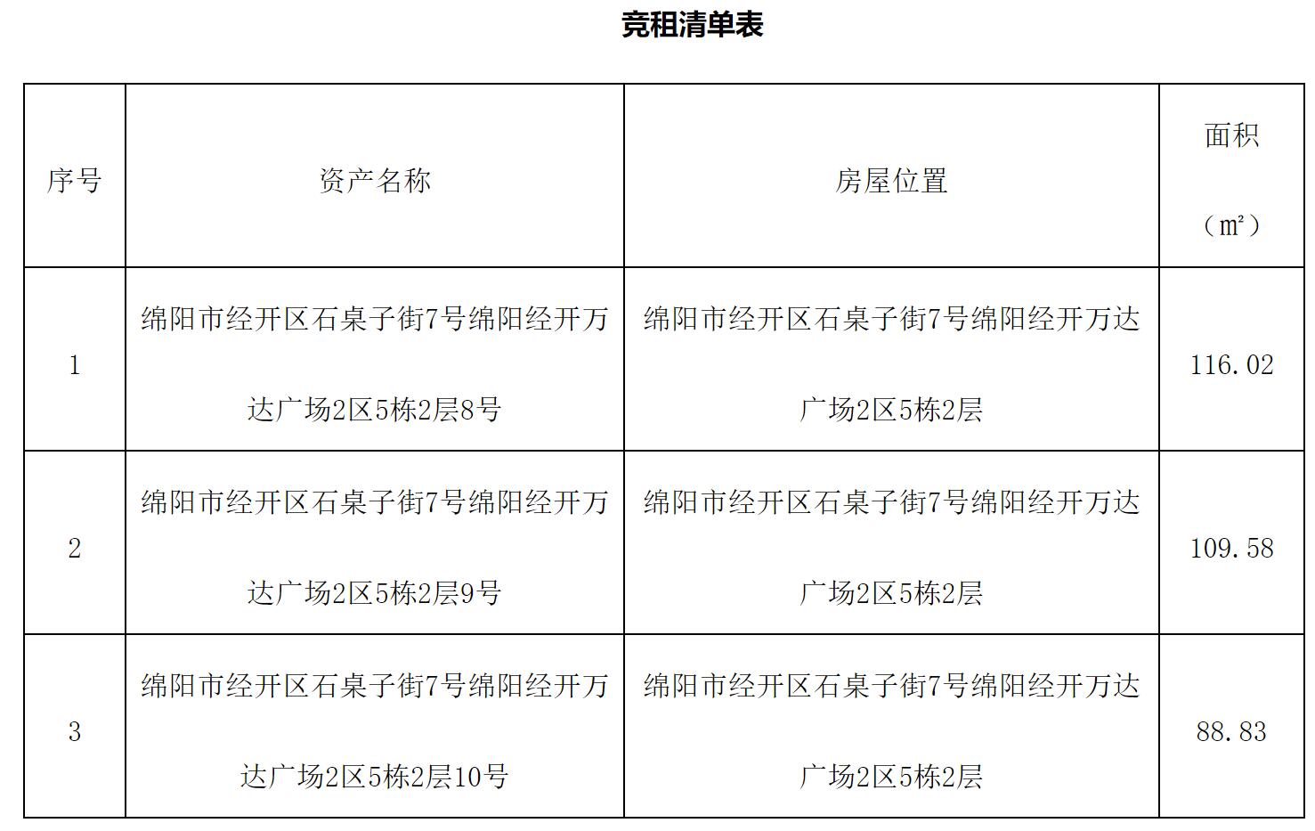 绵阳市粮油集团有限公司营销分公司现将公司代管位于绵阳市经开区石桌子街7号绵阳经开万达广场2区5栋2层8号、9号及10号的3处商业商铺资产面向社会进行公开竞价招租(详见竞租清单表),现将有关事宜公告如下: