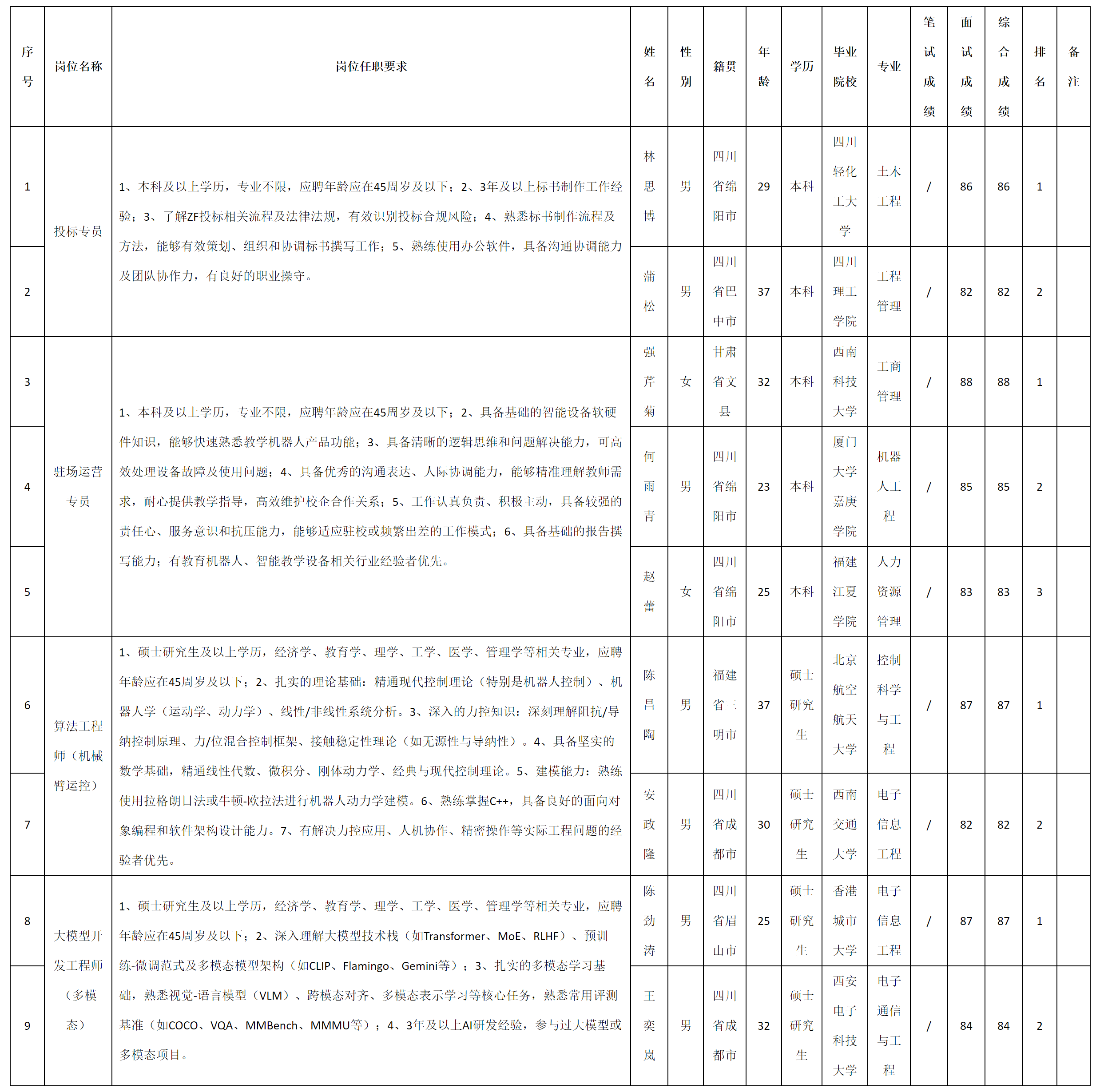 根据四川九洲投资控股集团有限公司软件与数据智能产业发布的招聘公告及招聘相关规定,现将测试成绩予以公示。