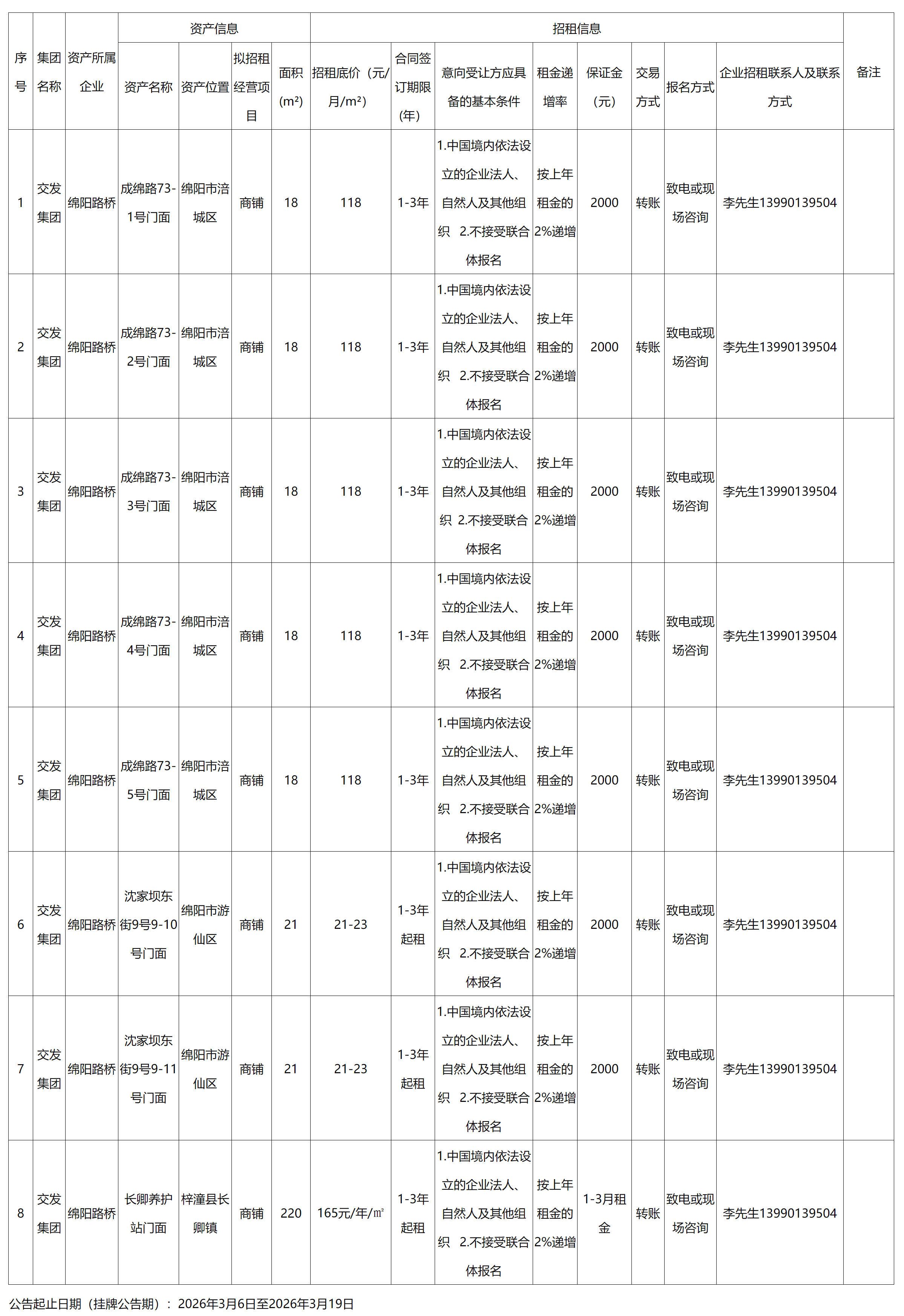 绵阳路桥建设集团有限责任公司资产招租信息公告(3月)
