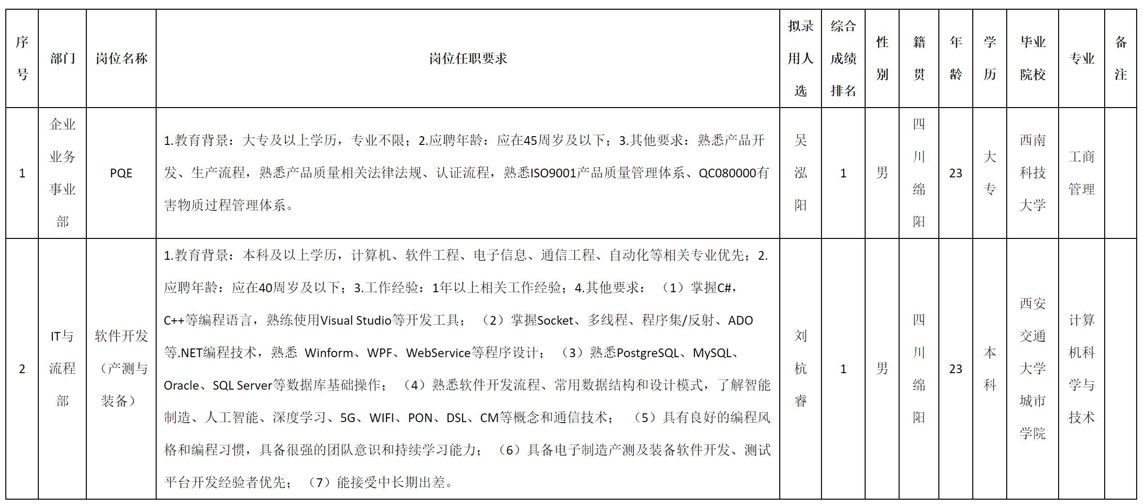 根据四川九州电子科技股份有限公司发布的招聘公告及招聘相关规定,经测试、考察、体检等程序,拟录用吴泓阳等2名同志到四川九州电子科技股份有限公司工作,现予以公示,具体情况如下: