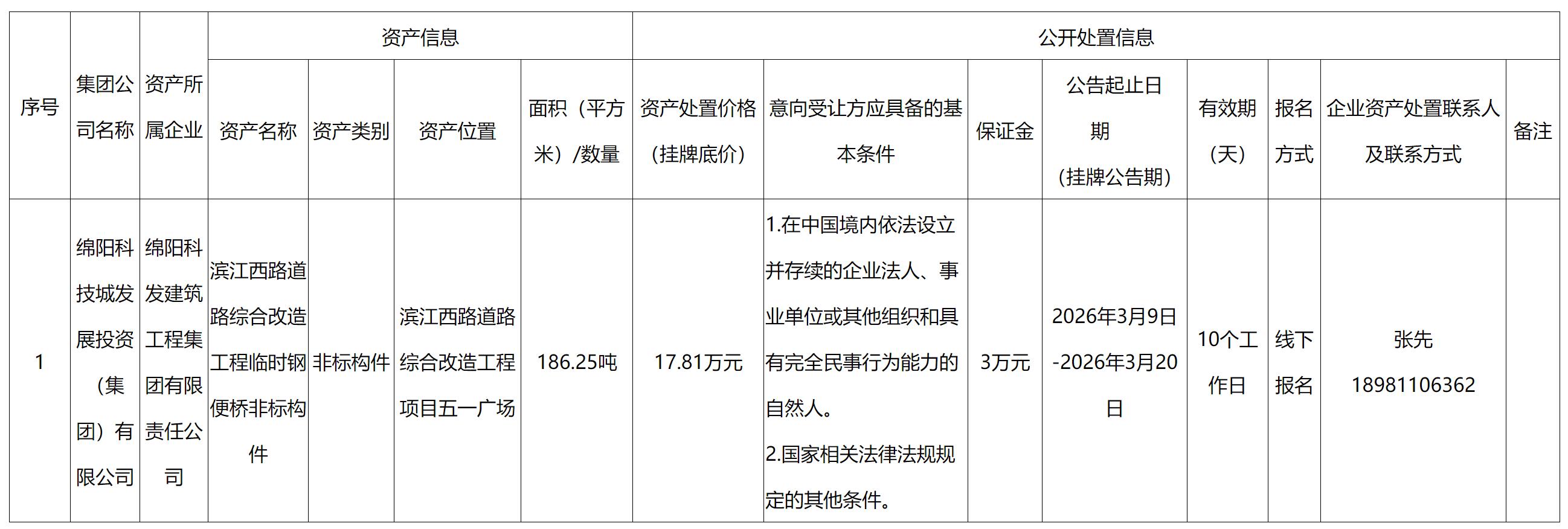 绵阳科发建筑工程集团有限责任公司资产处置公告