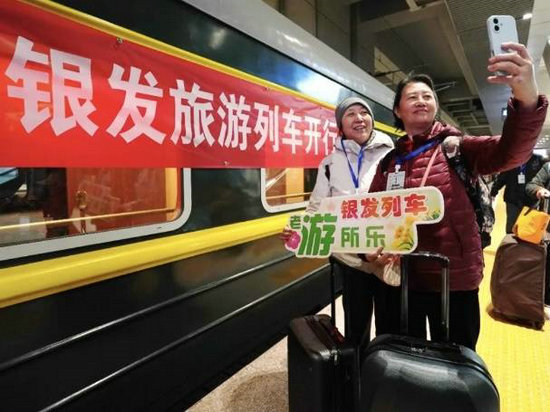 北京丰台站,游客和银发旅游列车合影。图片来源:新华社