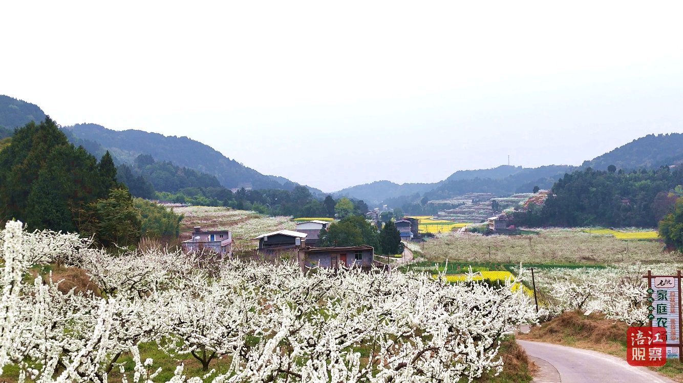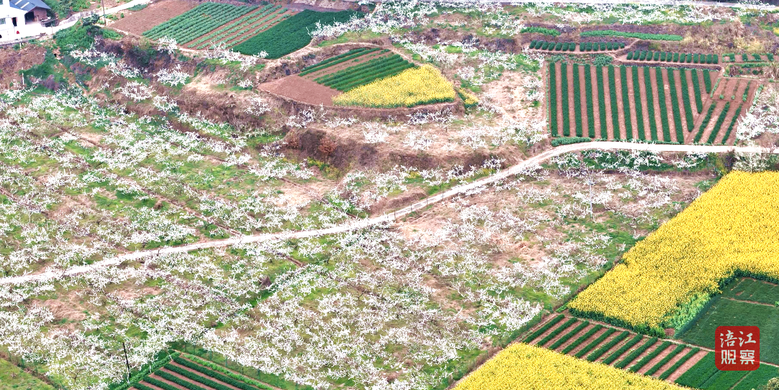 金黄油菜花穿插其间,与李花交相辉映,勾勒出“半坡白雪半坡金”的田园画卷。