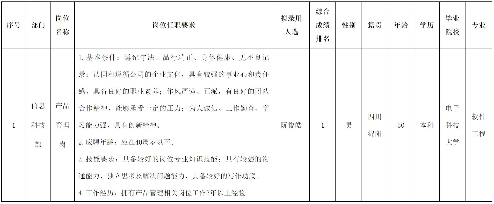 根据四川长虹集团财务有限公司发布的招聘公告及招聘相关规定,经面试、考察、体检等程序,拟录用阮俊皓同志到长虹财务公司工作,现予以公示,具体情况如下: