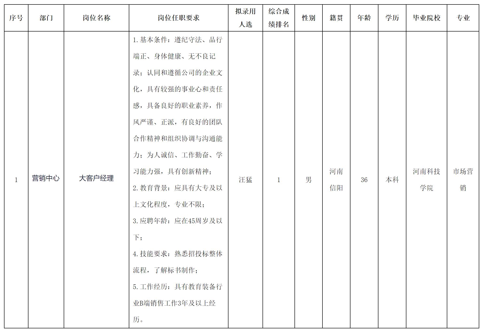 根据四川长虹教育科技有限公司发布的招聘公告及招聘相关规定,经面试等程序,拟录用汪猛同志到我公司工作,现予以公示,具体情况如下: