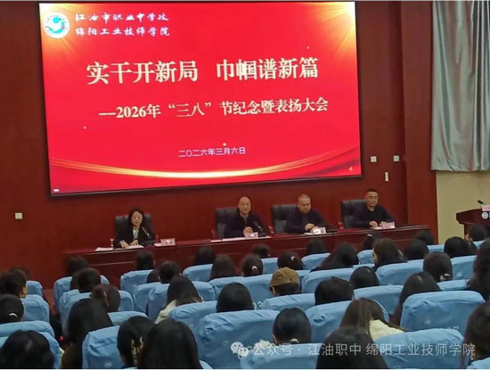 绵阳新闻网讯 3月6日,江油市职业中学校暨绵阳工业技师学院在学术厅隆重举行了以“实干开新局 巾帼谱新篇”为主题的2026年“三·八”国际妇女节纪念活动暨表扬大会,此次大会由该校党委副书记杨屏主持,党委书记卢鸿亮、校长王勇出席活动,全校女教职员工176人参与此次大会。
