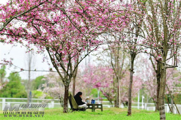 春日阳光明媚,市民在经开区三江体育公园樱花树下品茶赏景。记者 王勇 摄