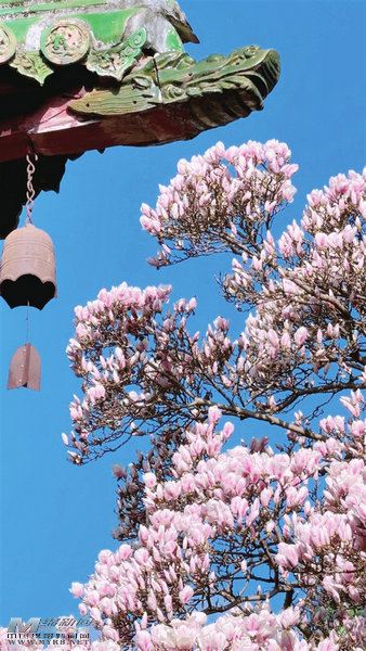 平武县报恩寺内玉兰花层层叠叠缀满枝头,与明代古建筑群相映成趣。记者 任露潇 摄