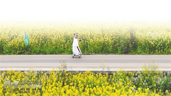 钱立群脚踩滑板穿越花海,就像在画里飞。 记者 李春梅 摄