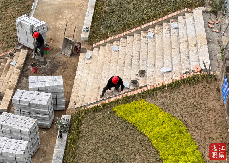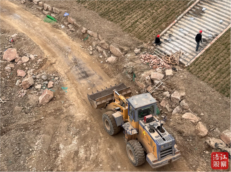 数十名工人正沿着岸线进行坡面修整和梯步砌筑作业,每隔数十米便可看到从堤顶延伸而下的梯步,将石阶与正在建设的生态步道衔接起来。现场机械与人工协同作业,整个施工区域繁忙而有序。