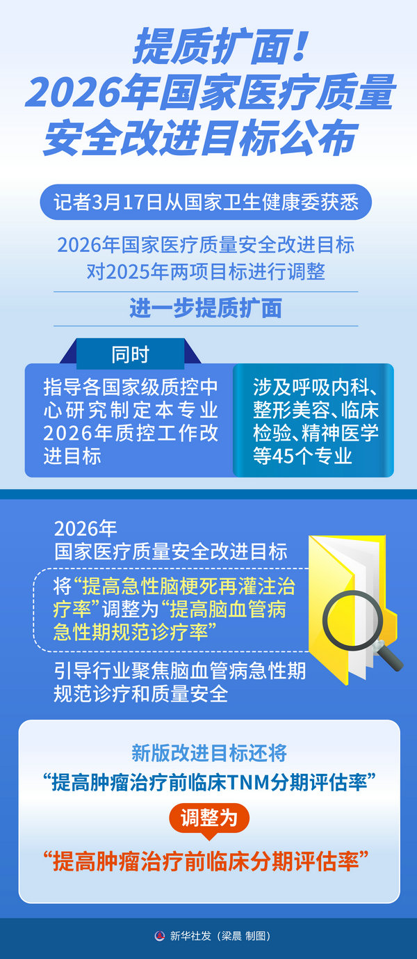 新华社北京3月17日电(记者 李恒)记者17日从国家卫生健康委获悉,2026年国家医疗质量安全改进目标对2025年两项目标进行调整,进一步提质扩面。同时,指导各国家级质控中心研究制定本专业2026年质控工作改进目标,涉及呼吸内科、整形美容、临床检验、精神医学等45个专业。