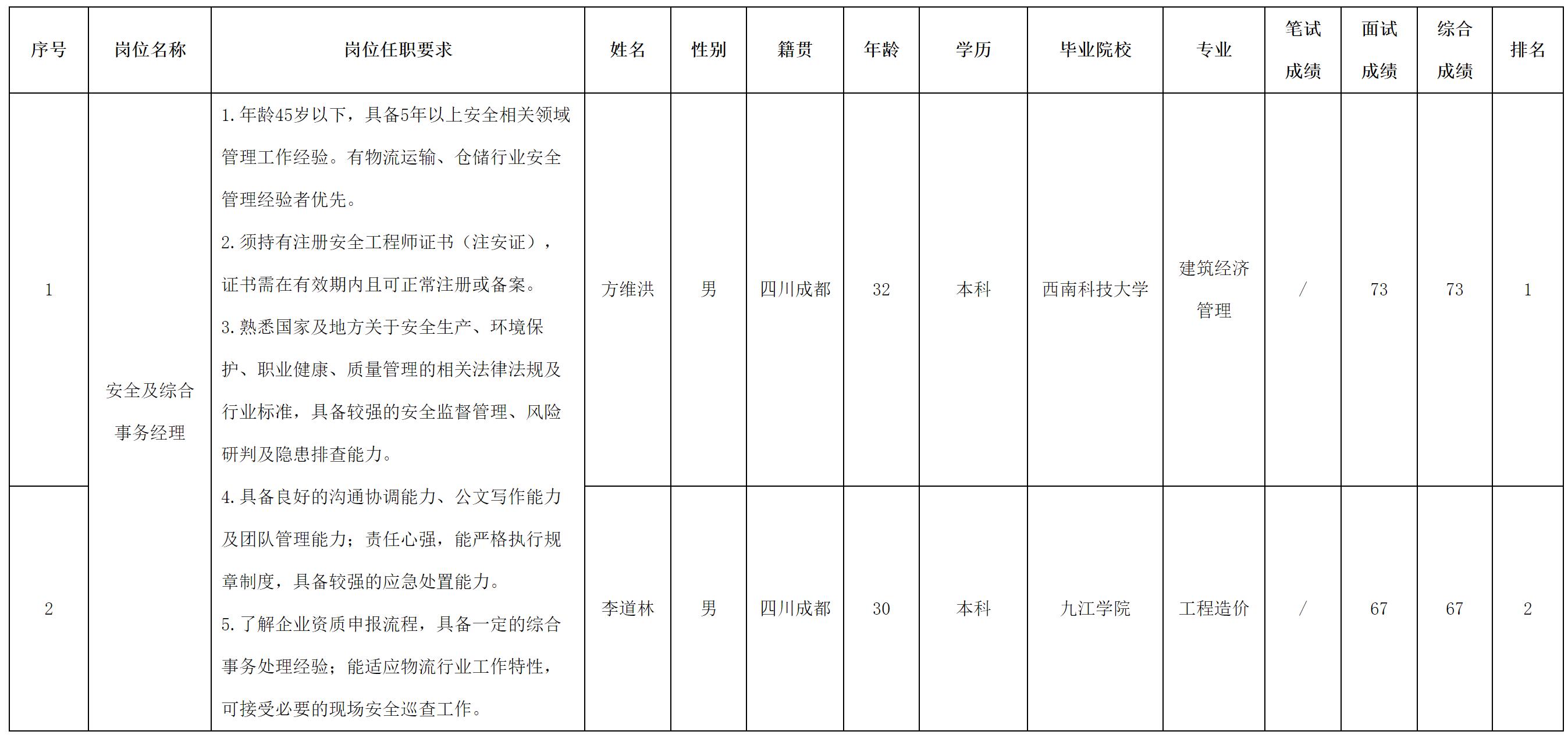根据四川长虹民生物流股份有限公司发布的招聘公告及招聘相关规定,经面试等程序,现将成绩予以公示。