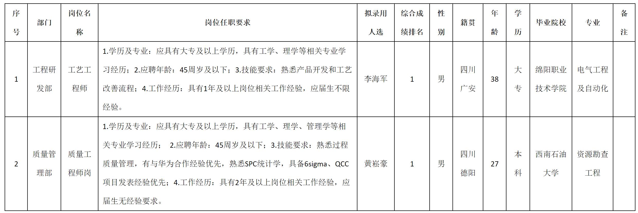 根据四川九华光子通信技术有限公司发布的招聘公告及招聘相关规定,经测试、考察、体检等程序,拟录用李海军等2名同志到四川九华光子通信技术有限公司工作,现予以公示,具体情况如下: