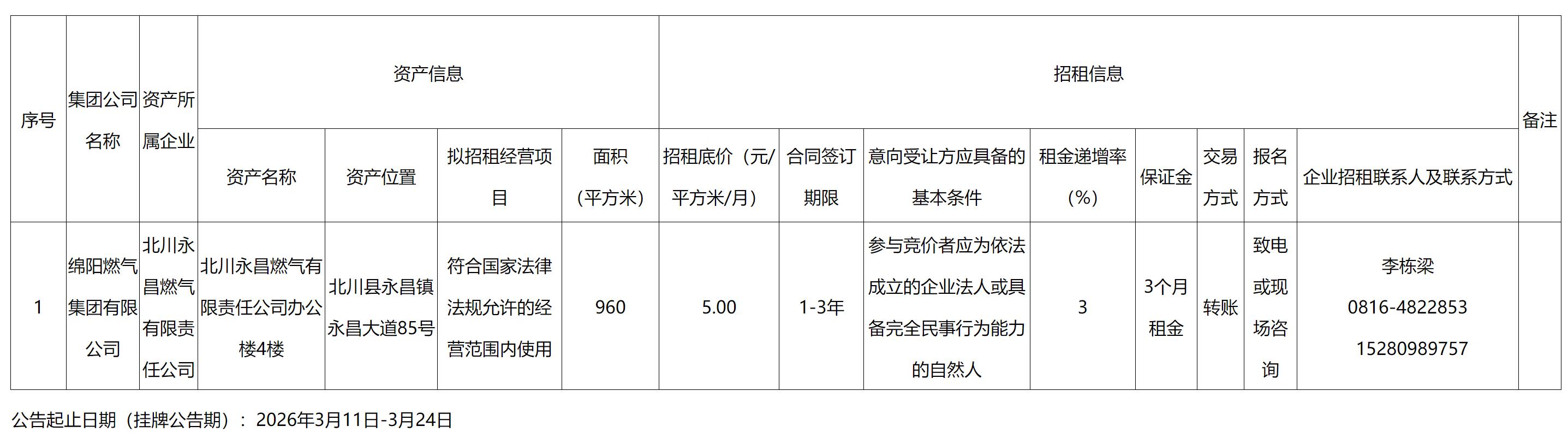 绵阳燃气集团有限公司资产出租公告