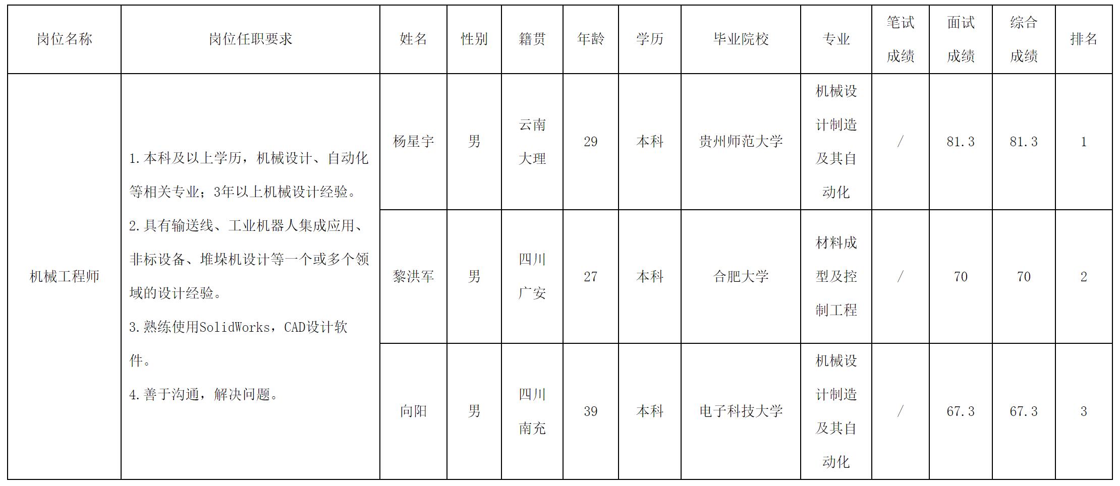 根据四川长虹智能制造技术有限公司发布的招聘公告及招聘相关规定,经面试等程序,现将面试成绩予以公示。
